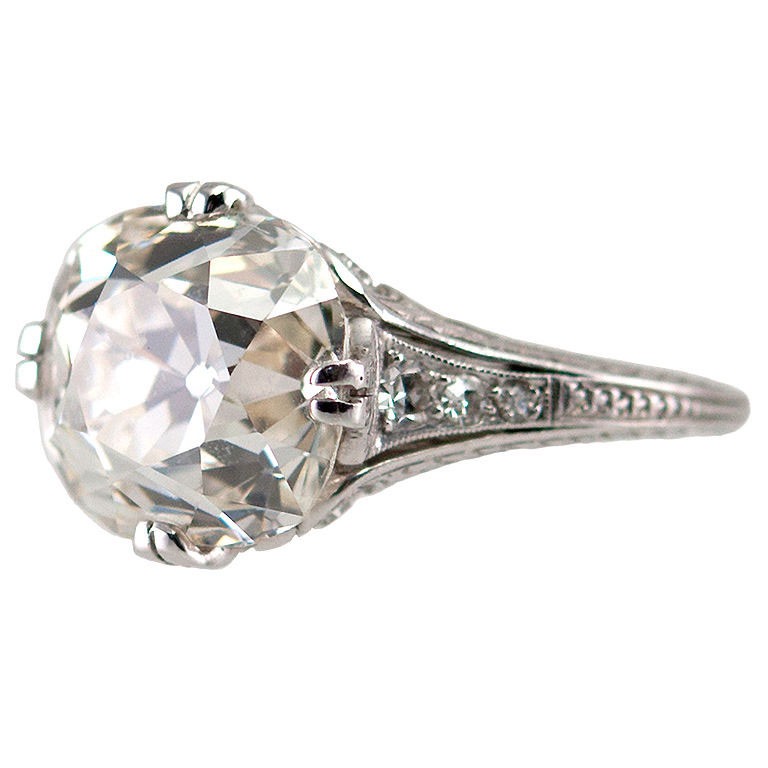 Platinum highly engraved ring. It has a center cushion cut diamond weighing 5.39cts K-VS2. The mounting has three diamonds at 12 and 6 o'clock and then three more down the sides! This ring is Spectacular!!