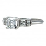 Platinum ring with a center .70 carat Asscher cut diamond. It is D color SI2 clarity with an EGL certificate. The sides have two small horizontal baguette diamonds and one vertical, all with beautiful mill grained accents. Very elegant.