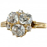 This unique Victorian ring consists of three Old Mine cut diamonds, which are approximately 1 carat each (totaling approximately 3 carats in total diamond weight) along with three small accent diamonds set in between the larger ones in 18 karat yellow gold, circa 1890s. The Old Mine cuts give these diamonds an awesome, chunky look that would make an incredible engagement ring or cocktail ring!